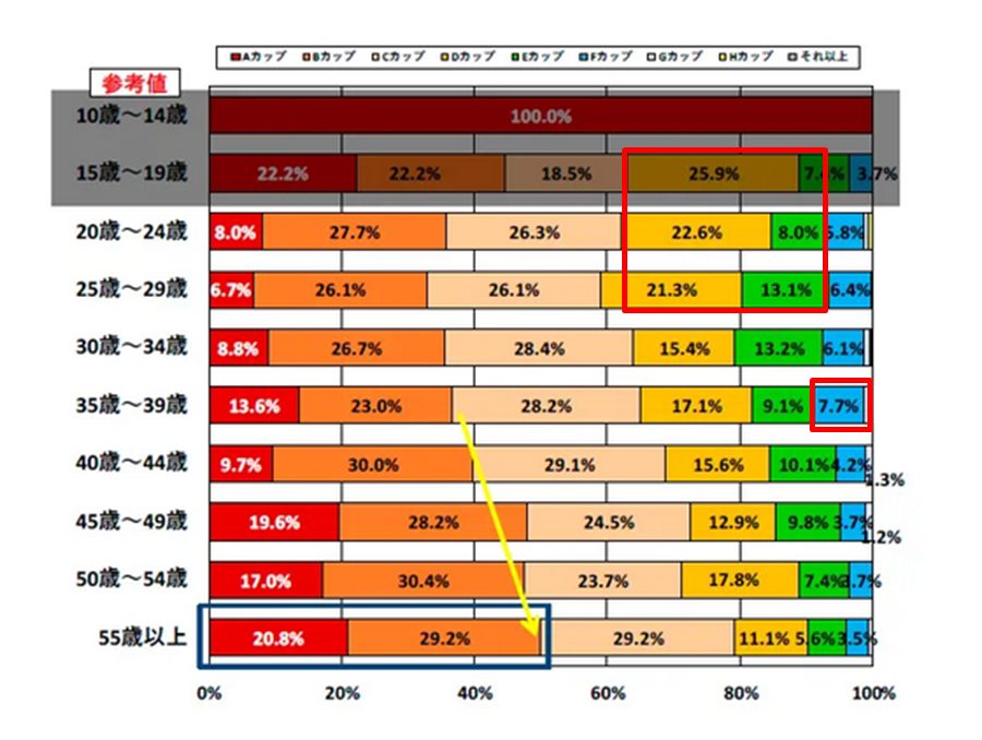 しかし、グラフを見ていただけるとわかるとおり、1o代後半と20代はDカップとEカップが合計で30%以上を占める世代で、若い世代程平均よりカップ数が大きい傾向があります。