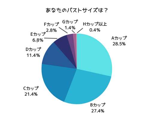 なので、このAカップとBカップが今回の調査でボリュームゾーンですが、サイズを勘違いしていることを想定して1カップ小さめのサイズを回答していると仮定すれば、本来のサイズはBカップ・Cカップがボリュームゾーンになり、実態に近い割合になると思われます。