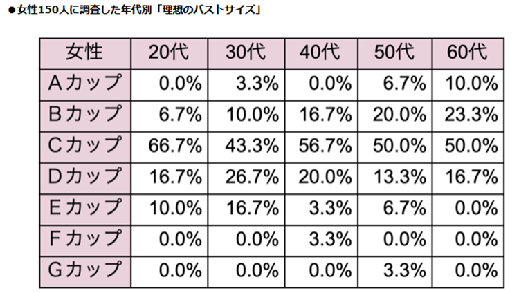 40代・50代でEカップが多いのは、若い頃の恋愛からきたものだと仮定するとフィッティングが主流ではなく、採寸が主流だったのでカップ数と実際のおっぱいの見た目のイメージの乖離が小さいことからきているのかなと思います。