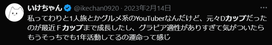 いけちゃんさんの自身の公式XアカウントでFカップであることを公言しています。